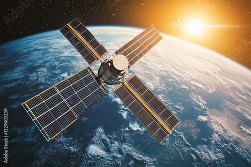 A satellite is seen in low Earth orbit, capturing sunlight on its solar panels while the sun rises over the blue planet below Generative AI