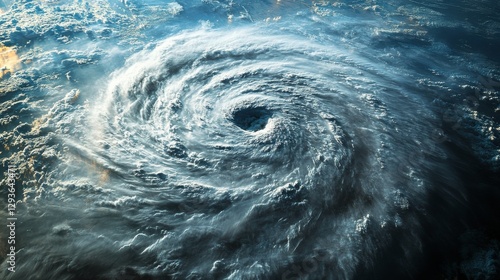 A satellite view of a massive hurricane in the ocean, showing its eye and spiraling clouds with vivid detail.