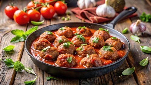A savory meatball dish cooked in a cast iron skillet with a rich tomato sauce simmering on top
