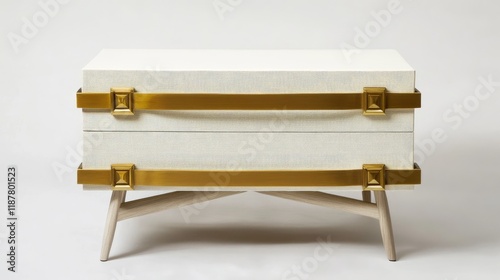 A Scandinavian-style commode with brass hardware and natural wood tones.
