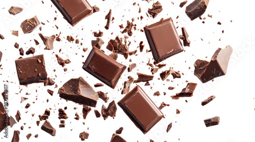 A scattered arrangement of chocolate pieces and shards on a white background.