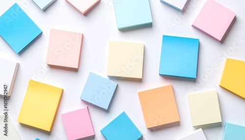 A Scattered Sticky Notes on White Surface Capturing Thought Bursts, Memory Triggers, and the Visual Energy of Creative Clarity