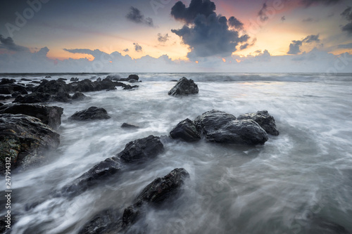 A scenery of sunrise with amazing unique rock formation and beautiful flow of wave at Kemasik beach, Terangganu Malaysia. Soft focus during long exposure shot.