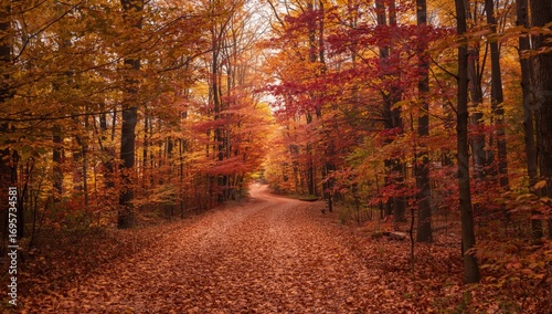 A scenic autumnal path winds through a colorful forest, bathed in warm hues of orange and red.