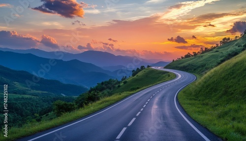 A scenic highway curves along a verdant hillside, offering a captivating view of majestic mountains during a vibrant sunset.