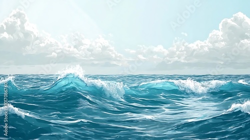 A scenic image of blue ocean water with white capped waves. The sky is a bright blue with white clouds.
