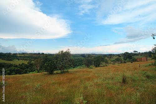 A scenic landscape with a clear blue sky, scattered clouds, grassy fields, and trees that shows a peaceful summer day in the rural countryside of Mondulkiri, Cambodia