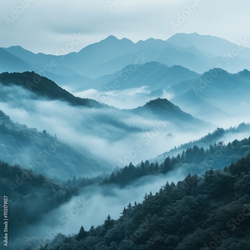 A scenic mountain landscape featuring a tranquil atmosphere with fog rolling through the valleys and lush green forest covering the terrain, illuminated by soft and diffused natural light.