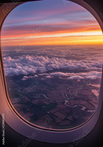 A scenic sunrise captured from an airplane window reveals a breathtaking landscape of fields and a winding river.