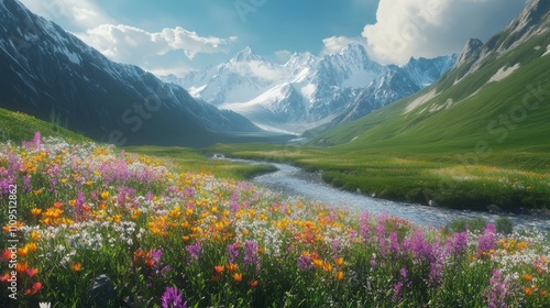 A scenic valley covered in wildflowers, with a winding river and snow-capped mountains in the distance
