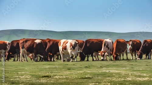 A scenic view of a herd of cows grazing on a sprawling, green pasture. The background features rolling hills and a clear blue sky, emphasizing the natural and serene environment.