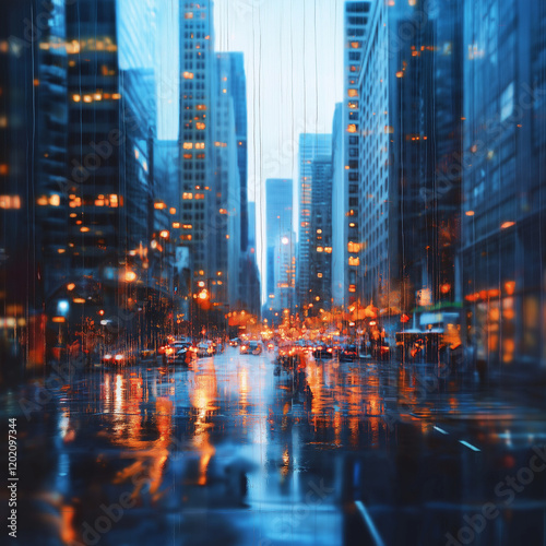 A Scenic View of a Modern Urban Street with Skyscrapers and Reflections on a Rainy Day