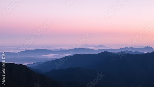 A scenic view of layered mountain ranges under a pastel colored sky at dusk or dawn with soft lighting