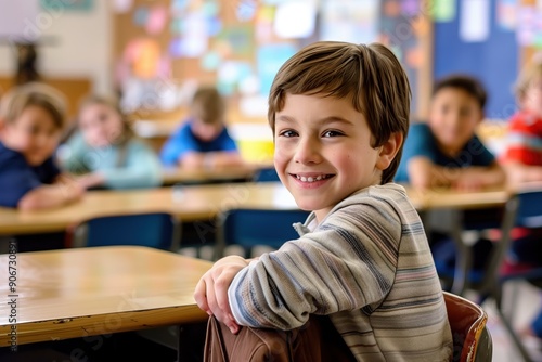 A school boy sits at his desk and smiles in the background of a classroom with other students