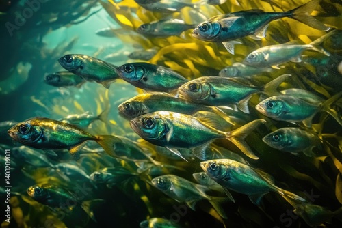 A school of iridescent fish swims amidst vibrant kelp forests, showcasing their beautiful scales and natural habitat.