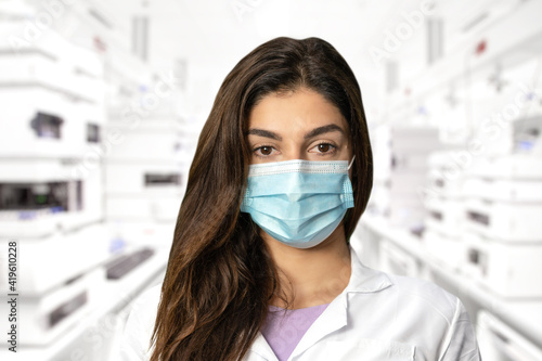 A scientific researcher in a surgical gown and mask. In the background the blurred medical laboratory.