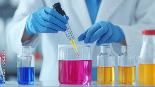 A scientist carefully adds a colorful substance to a beaker using a pipette in a modern laboratory setting.