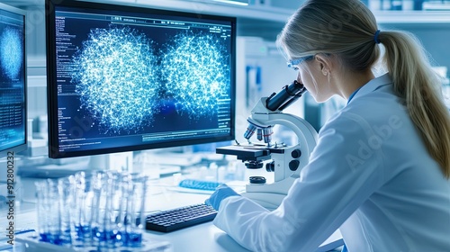 A scientist examines samples using a microscope while analyzing data on a computer in a modern laboratory setting