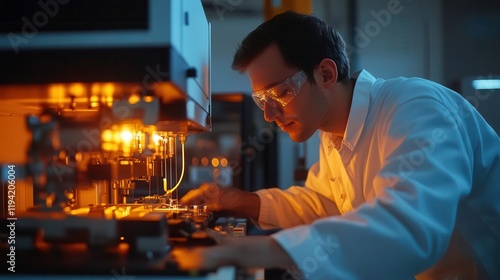 A scientist in a lab coat intently examines equipment, illuminated by warm light, showcasing a focus on research and innovation in a laboratory setting.