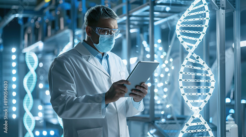 A scientist in white coat and mask working on an iPad, surrounded by DNA strands floating around him