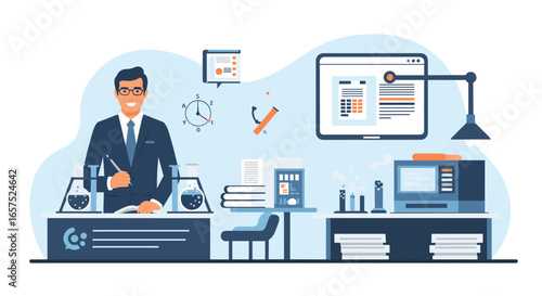 A Scientist Is Working In A Modern Laboratory, Depicting Science, Research, And Innovation With Digital Technology And Experiments, Illustrated In A Flat Design Style.