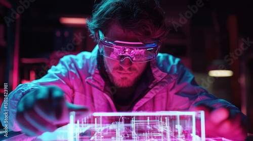 A scientist wearing AR glasses, analyzing a holographic blueprint of a groundbreaking invention with USA colors glowing