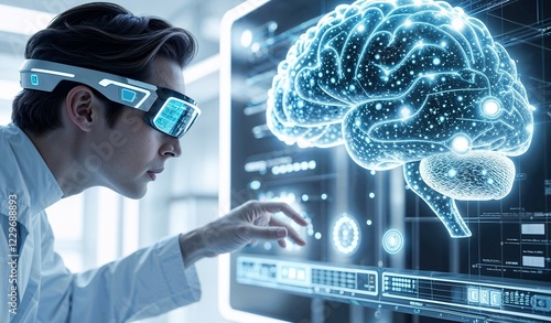 A scientist wearing high-tech augmented reality glasses interacts with a fully digital, holographic AI brain projection composed of millions of tiny, luminescent data particles.