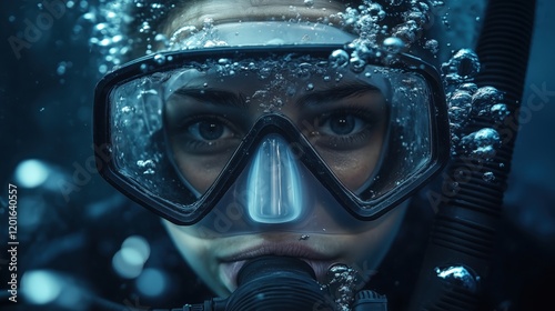 A scuba diver peers directly into the camera, their goggles and breathing apparatus reflecting the underwater light, surrounded by rising bubbles.