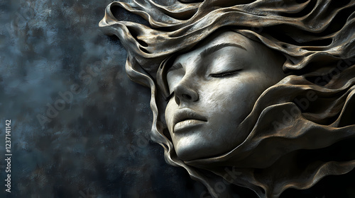 A sculptural representation of a serene face with flowing, layered elements, conveying a sense of calm and depth against a dark background. Sculptural Depth. Illustration