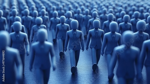 A sea of abstract blue figures representing unity and collective movement toward a common purpose or goal.