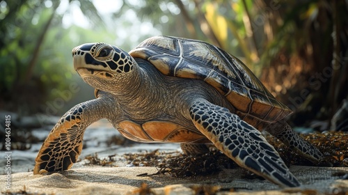 A sea turtle walks on a sandy beach with green foliage in the background.