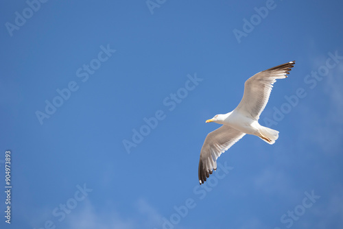 A seagull is gracefully soaring in a clear blue sky with a few scattered clouds on a sunny day, capturing the essence of freedom, peace, and nature in this serene view.