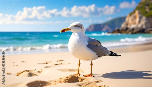 A seagull stands on a sandy beach, with ocean waves lapping the shore. Hills are in the background. Bright sunshine and a clear blue sky