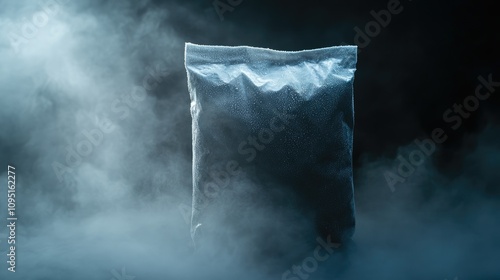 A sealed bag of black powder against a smoky background, suggesting mystery or industry.