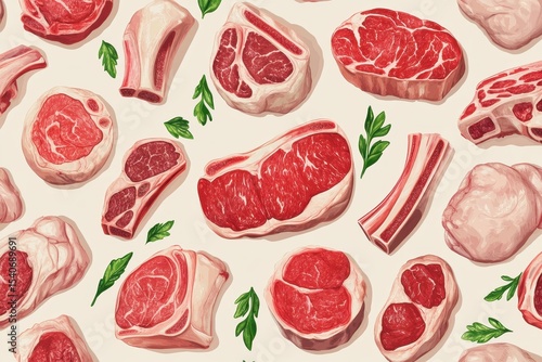 A seamless design with various meat cuts like ribeye steak, A seamless design featuring various meat cuts