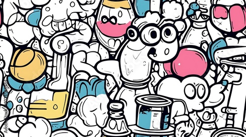 A seamless doodle pattern of a colorful science lab, featuring beakers, test tubes, microscopes, chemical symbols, and atom models arranged in a lively and balanced layout.