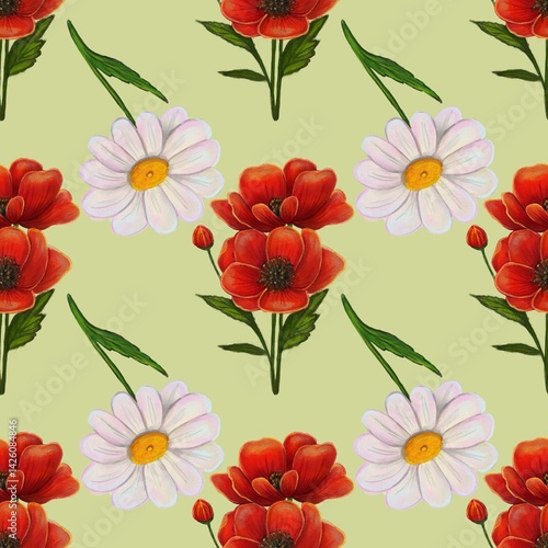 A seamless floral pattern featuring red poppies and white daisies on a light green background. The flowers are arranged in a symmetrical design, showcasing vibrant colors and detailed illustrations.