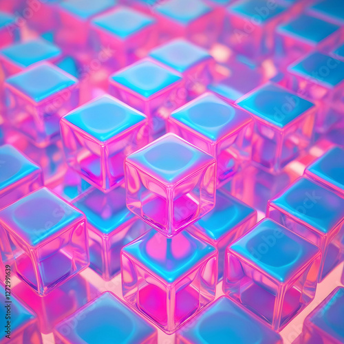 A seamless holographic pattern featuring pink and blue isometric square cubes with a plastic jelly-like texture.