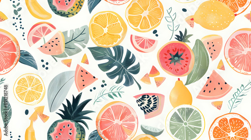 A seamless pattern featuring a variety of tropical fruits such as pineapples, lemons, grapefruits, and watermelons, along with lush green leaves on a white background. Perfect for summery and fresh