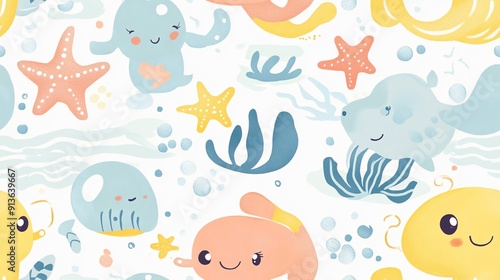 A seamless pattern featuring cute sea monsters and adorable underwater creatures. The design showcases friendly sea monsters with soft, rounded shapes and pastel colors, interacting with charming sea