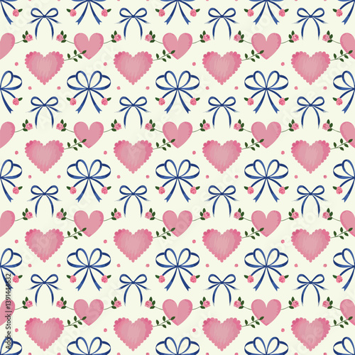 A seamless pattern featuring stitched pink hearts, blue bows, and tiny floral accents on a cream background, ideal for romantic or vintage designs.