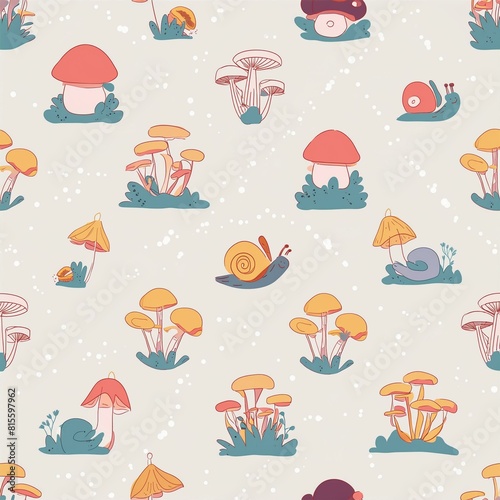a seamless pattern featuring various species of mushrooms and fungi, paired with wood
