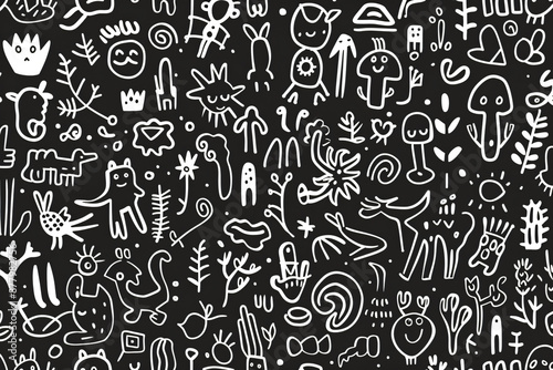 A seamless pattern of an intricate doodle drawing with many abstract shapes and lines, simple doodling drawn on black paper using white ink, whimsical, hand-drawn doodled drawings