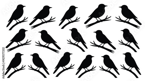 A seamless pattern of black silhouette birds perched on branches against a white background