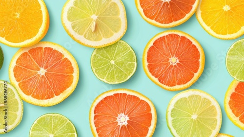 A seamless pattern of bright citrus slices--lemons, oranges, and limes--on a light blue background, creating a fresh, summery feel.