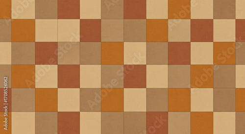 A seamless pattern of colorful quilted squares in earth tones on a tan background