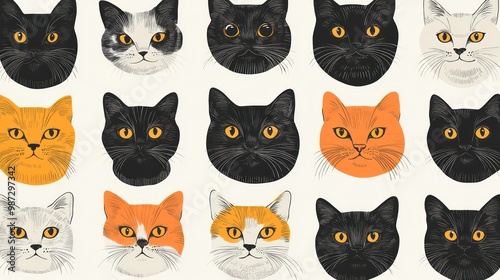 A seamless pattern of cute cat faces with yellow eyes in black, white, and orange on a beige background.