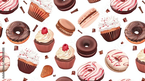 A seamless pattern of delicious-looking donuts, cupcakes and macarons.