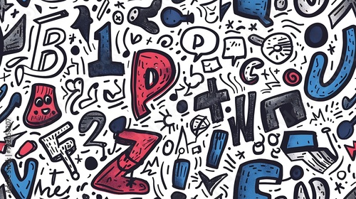 A seamless pattern of doodles with letters and numbers in quirky and playful fonts, arranged chaotically, vibrant colors, on a light gray background, fun and energetic design, hd quality.