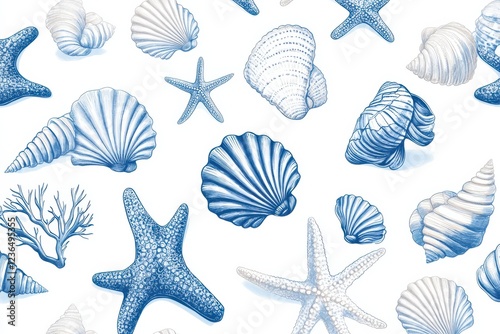 A seamless pattern of hand drawn blue line art seashells, starfish and corals on a white background